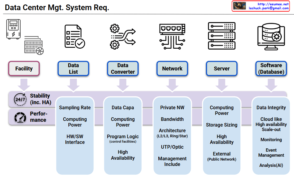 - Data Capacity, Computing Power, Program Logic (control facilities), High Availability
