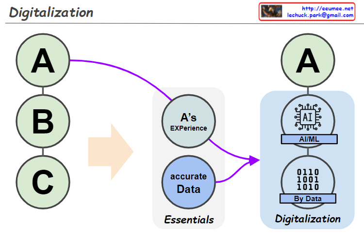 The image depicts three levels of experience, A, B, and C, highlighting that while A represents a high level of experience, levels B and C can be enhanced through digital transformation using data and AI technologies. This transformation underscores that the collection and analysis of accurate data are essential elements, as they lay the foundation for AI systems to perform sophisticated learning, thus improving operational efficiency and precision.