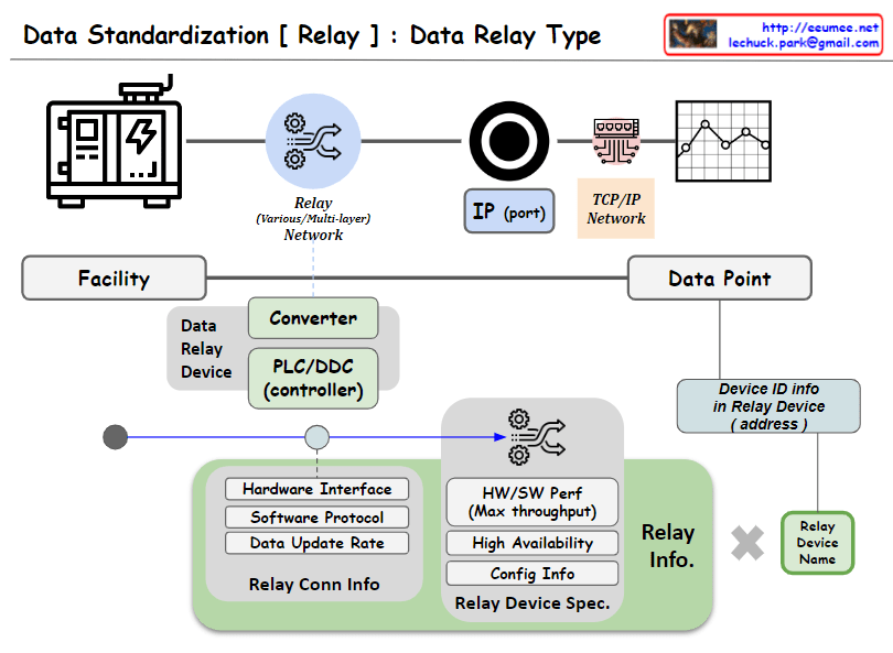 Data Relay Device: It serves as an intermediary, relaying data collected from the facility to the network. It is depicted as being connected to the network via an IP address and port number.