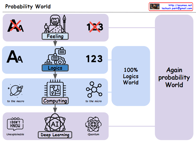 The image intends to explain two critical perspectives of AI/ML. First, it illustrates that while traditionally digitalized data was defined by rules, AI/ML enables us to judge human ‘feelings’ as data based on a more extensive dataset. Second, AI/ML allows for the prediction of the future using data; however, some parts of these significant advancements remain unexplainable and difficult for humans to comprehend fully. This interpretation suggests that while AI aims to quantify and use non-visible elements like emotions for predictions through data standardization and optimized processing, there are aspects that cannot be fully articulated or understood.