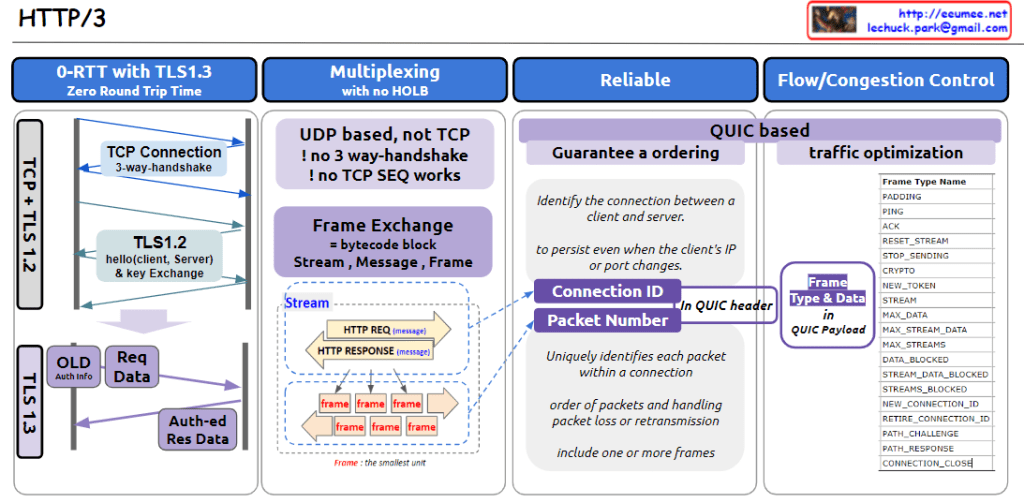 The image also details the QUIC header structure, explains how packet ordering and loss handling work, and provides a comprehensive list of frame types used in HTTP/3.