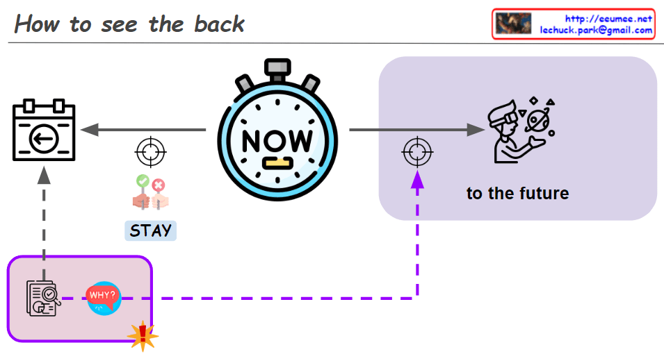 The modified image displays a diagram titled “How to see the back” which seems to represent a conceptual understanding of time. At the center, there is a stopwatch labeled “NOW,” indicating the present moment. A line extends from the stopwatch to the left toward a camera icon, representing the past. From the camera, another line descends to a house icon with the word “STAY,” suggesting that focusing solely on the past may result in staying in the present without progress.