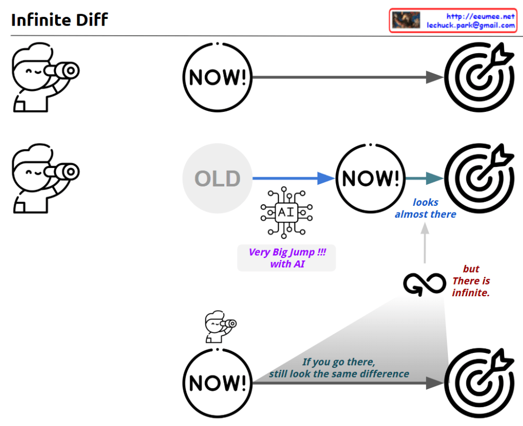 The diagram conveys a philosophical message about progress and perfection: while AI can help make significant leaps forward, there will always be infinite room for improvement. Even as we get closer to our goals, there’s always space to grow and improve further.