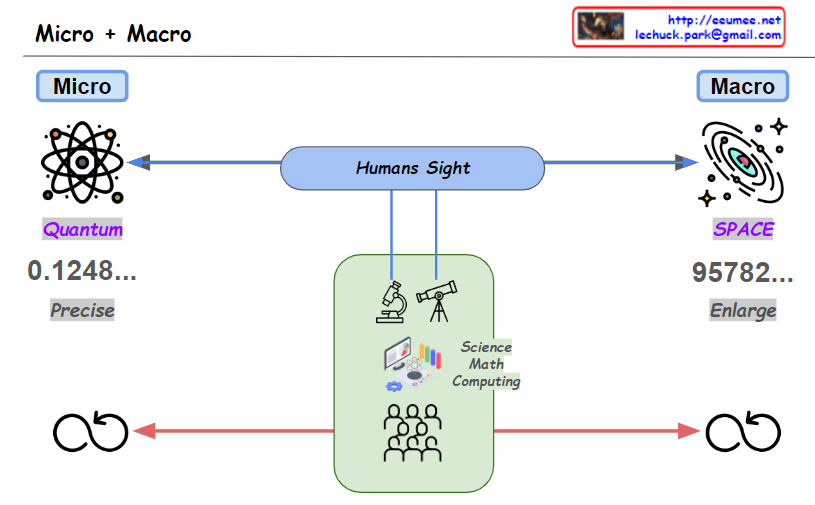 This diagram visually represents the concept that human cognitive abilities can be extended through AI tools and data analysis, enabling deeper mutual understanding between microscopic details and macroscopic patterns. It illustrates the complementary relationship where understanding small details leads to better prediction of the big picture, and understanding the big picture leads to more accurate prediction of details.