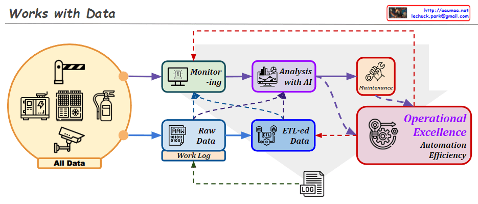 The image describes a data workflow process that involves various stages of data handling and utilization for operational excellence. “All Data” from diverse sources feeds into a monitoring system, which then processes raw data, including work logs. This raw data undergoes ETL (Extract, Transform, Load) procedures to become structured “ETL-ed Data.” Following ETL, the data is analyzed with AI to extract insights and inform decisions, which can lead to actions such as maintenance. The ultimate goal of this process is to achieve operational excellence, automation, and efficiency.
