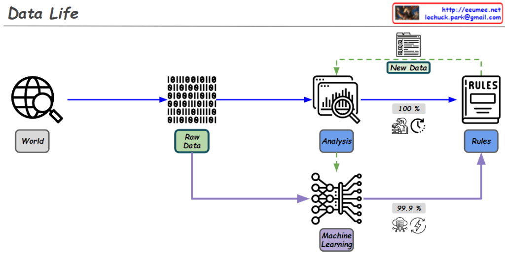 This diagram effectively illustrates how human logical research and AI-driven data learning work together in the data processing lifecycle.