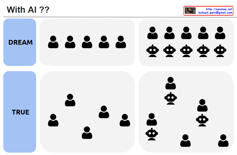 The image is divided into “DREAM” (ideal) and “TRUE” (reality), contrasting human society and AI integration scenarios.