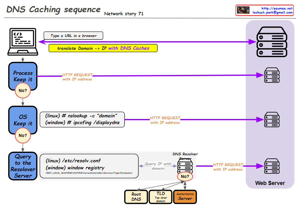 - OS Keep it: Checks the operating system-level DNS cache. For Linux, it uses the “nslookup -c domain” command, while for Windows, it uses “ipconfig /displaydns”. If the information isn’t found here (“No”), it proceeds to the next step.