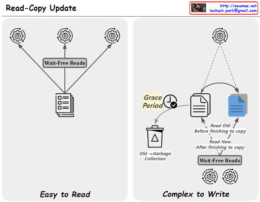 The image explains the “Read-Copy Update” mechanism, illustrating the process of reading and writing data in concurrent programming divided into two parts.