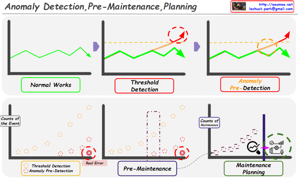 This image illustrates the concepts of Anomaly Detection, Pre-Maintenance, and Planning in system or equipment management.