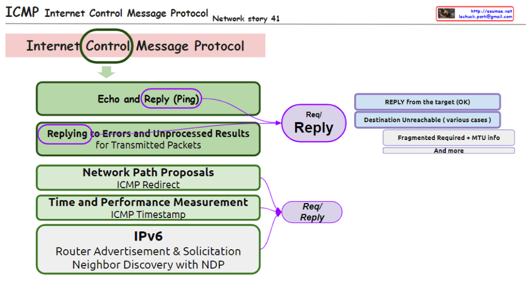 This image succinctly demonstrates the essential functions of the Internet Control Message Protocol (ICMP), emphasizing the protocol’s ability to check network paths and status through simple request and response actions. This includes echo (ping) operations, error messages, network path change suggestions, timing measurements, and IPv6 functionalities, all contributing to the efficiency and performance enhancement of network operations.