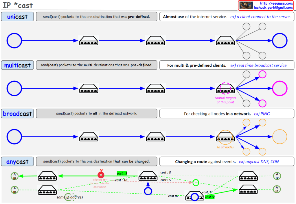 Anycast is slightly different, targeting a specific address but sending the data to the closest/nearest device with that address, as determined by the routing protocols and BGP (Border Gateway Protocol) peering.