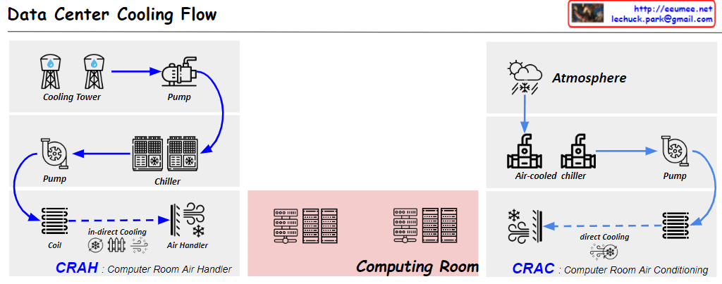 - Flow: Water Pump → Cooling Tower → Chiller → CRAC/CRAH (Computer Room Air Conditioning/Handler)