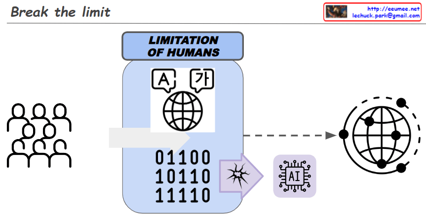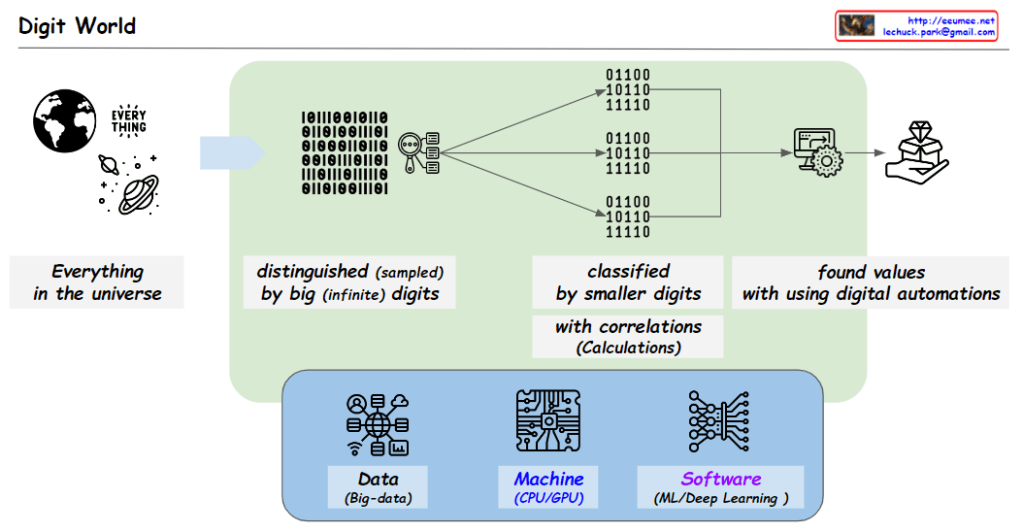 The diagram suggests a continuous spectrum of investigation from quantum mechanics (represented by qubits) all the way to cosmology (represented by questions about the universe’s beginning and end), with change being the common thread that connects these different scales of existence.